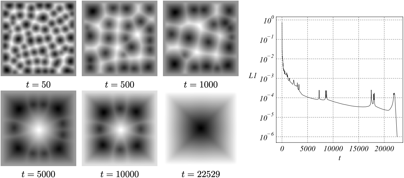 \[ \dfrac{\partial u}{\partial t}=\alpha u-\mu \nabla^2u-\nabla^4u+ k\nabla \cdot |\nabla u|^2\nabla u+ \beta\nabla\cdot \left(\nabla^2 u \nabla u \right) - \gamma\nabla\cdot u \nabla u + \delta \nabla^2|\nabla u|^2 \nonumber \] Generalized Dirichlet boundary conditions (\(u={\partial u}/{\partial n}=0\)) are assumed for the numerical integration of the governing equation. The numerical scheme consisted of the classical operator splitting scheme of stabilizing correction [4], presenting fourth-order diffusion operators. The \(L_1\) norm was used to measure the rate of change of the distance between two successive states of the system, therefore, it is sensitive to the evolution of both the amplitude and the phase. Steady states assumed for \(L_1 \leq 1 \times 10^{-6}\).